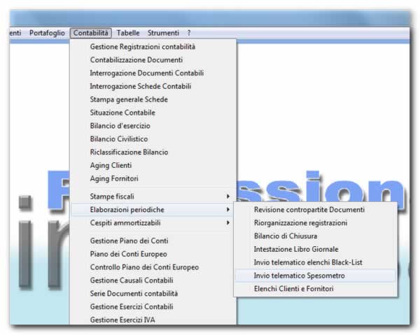Dal menu principale selezionare Contabilità, poi selezionare Elaborazioni periodiche, quindi “Invio telematico Spesometro” come indicato nella figura sottostante: