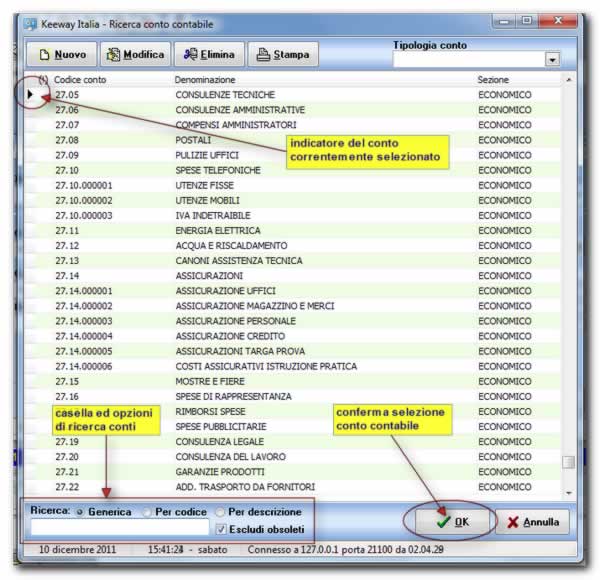 La schermata seguente mostra la finestra di ricerca dei conti contabili:
